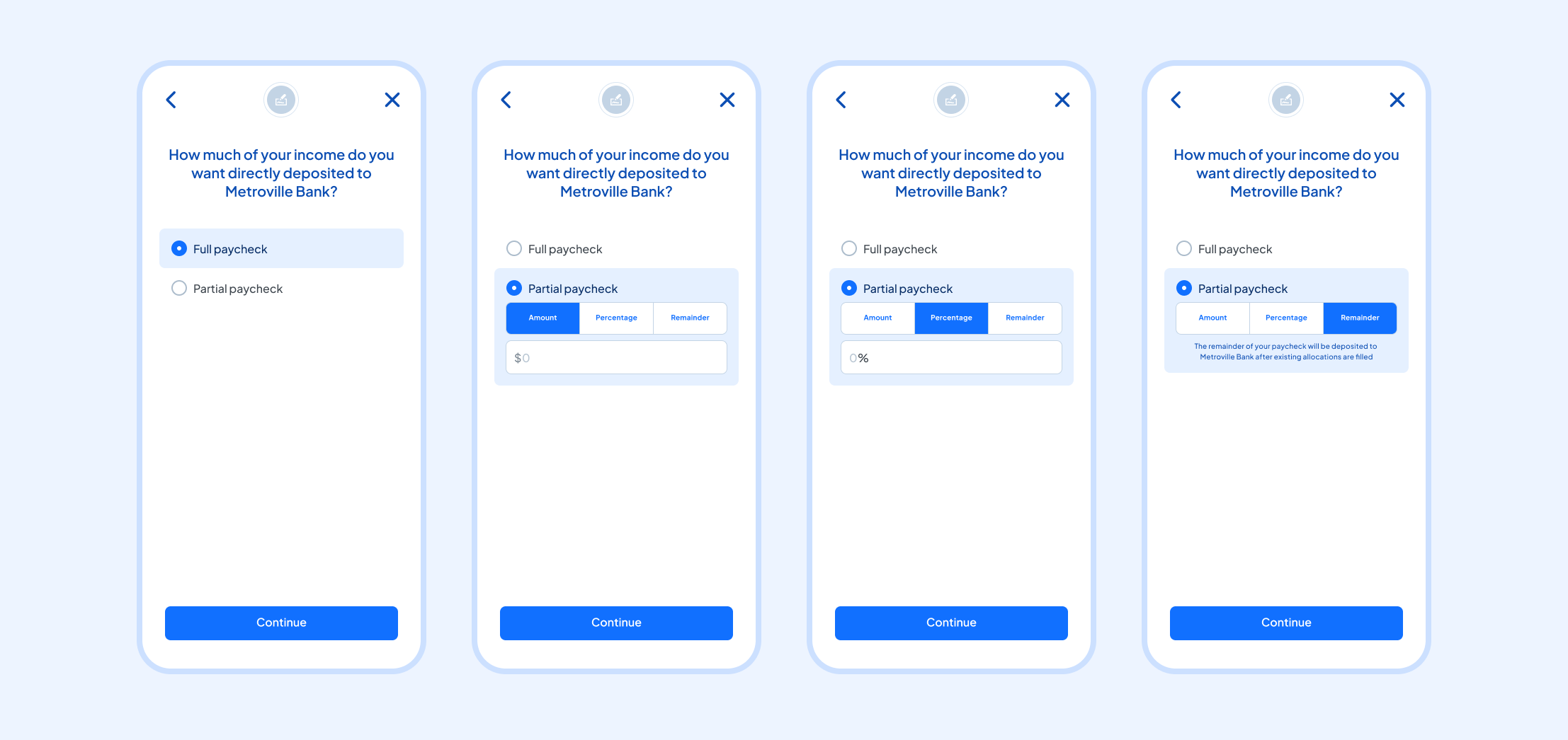 - Percentage: allows users to allocate a proportion of each paycheck to be sent to the account specified (for example, 20%).